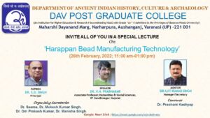 दिनांक 26/02/2022 को प्राचीन भारतीय इतिहास, संस्कृति एवं पुरातत्त्व विभाग द्वारा आयोजित विशेष व्याख्यानमाला के अंतर्गत IIT , GANDHINAGAR के एसोसिएट प्रोफ़ेसर डॉ वी एन प्रभाकर ने “Harappan Bead manufacturing Technology” पर अपना विशिष्ट व्याख्यान प्रस्तुत किया I
