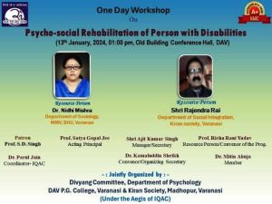 डी ए वी पी जी कॉलेज में शनिवार को आईक्यूऐसी के अंतर्गत दिव्यांग कमेटी, मनोविज्ञान विभाग एवं किरण सोसाइटी के संयुक्त तत्वाधान में दिव्यांगजनों का मनो-सामाजिक पुनर्वास विषय पर विशेष कार्यशाला का आयोजन किया गया. मुख्य वक्ता महिला