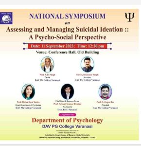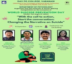 विश्व आत्महत्या रोकथाम दिवस के उपलक्ष में सोमवार को डी ए वी पी जी कॉलेज में मनोविज्ञान विभाग एवं सिप्सा द्वारा संचालित यूथ फ्रेंडली सेंटर के संयुक्त के तत्वाधान में मनोविज्ञान सामाजिक परिपेक्ष्य में
