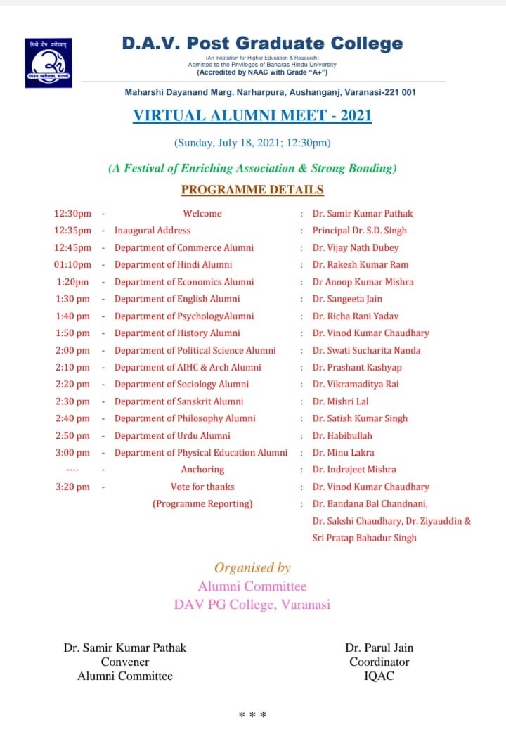 A Virtual Alumni Meet was organized on 18th July, 2021 by Alumni Committee DAV PG College, Varanasi. There were 50 alumni who joined the meet. Thestudents of English Department who shared their experiences were Mr Samrat  Bisai, (2010-12 batch), Assistant Professor, Ramkrishna Mission Brahmanand College of Education, Rahara, Kolkatta; Somsuvra Midya (2011 -13 batch), Assistant Professor, Calcutta Girls’ College Calcutta University;  Mr Amar Chakrabortty (2014-16 batch), Assistant Professor of English, Government PG College, Beohari,Shahdol, MP; Mr Chandra Prakash Tiwari, a PGT teacher in Navodya Kendriya Vidalaya, Aar Bhojipur; Tirthendu Ganguly  a poet and author, has penned the internationally published poetry book titled Firefly of Love which won the India Book of Records (2020) in the category: “Debut Poetry Book Sold in Maximum Countries;” Shivram K  aka Bipin (2011-13 batch)  a novelist, short-story writer and poet has authored books like ‘The Scorpion Grasses’ – a novel, and a poetry book The Room That I’ve Found; Ms Hemlata, Assistant Teacher in Basic Education Department U.P. T hey shared their success stories and appreciated the cooperation and motivation of their teachers. The other alumni who grace the occasion were Dr. Pratibha Patel, Abhishek Dubey, Vishav Bhushan, Hari Om,  Shubham Mishra, Ranbeer Trivedi, Praveen, Ganesh, Jyoti Nath Pandey, Vipin Kumar Rawat,  Ashish Dubey .