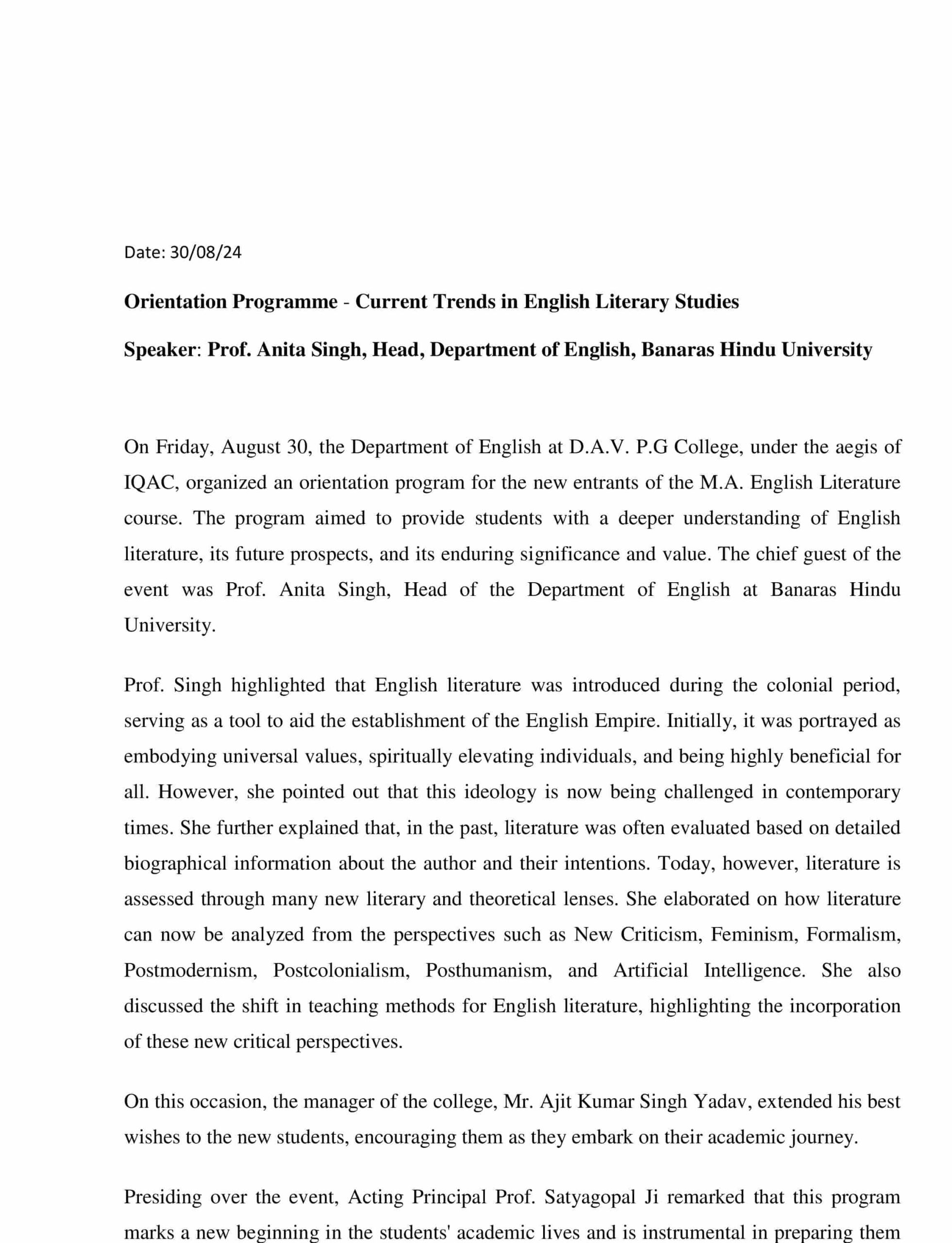 Department of English, DAV PG College, Varanasi organized a lecture under orientation programme  on 15-02-2022 at 02:00 pm in online mode. The lectureLiterature,Language, Culture - An Insight 3 englishwas delivered by Prof. Krishna Mohan Pandey, Head, Department of English, Banaras Hindu University, Varanasi. Speaking on ” Literature, Language, Culture: An Insight” Prof. Pandey highlighted the role of literature in sustainingLiterature,Language, Culture - An Insight 2 englishhuman values. He pointed out that humanity is above power position and status. Literature widens the horizon of mind and teaches us that even the minimal object, role and position is meaningful and valuable in itself. Literature makes no distinction in terms of class, caste and gender. Through different geners of literature we learn about cultures. He said that a piece of literature having all-inclusive vision gives essence to human life. Dr. Indrajeet Mishra conducted the programme and welcomed Prof. Pandey. He said that literature written in any language must represent the best of culture. Vote of thanks was delivered by Dr. Najmul Hasan. Dr. Sangeeta Jain, Dr. Bandana Bal Chandnani, Dr. Mahima Singh and around 110 students were present in the programme.